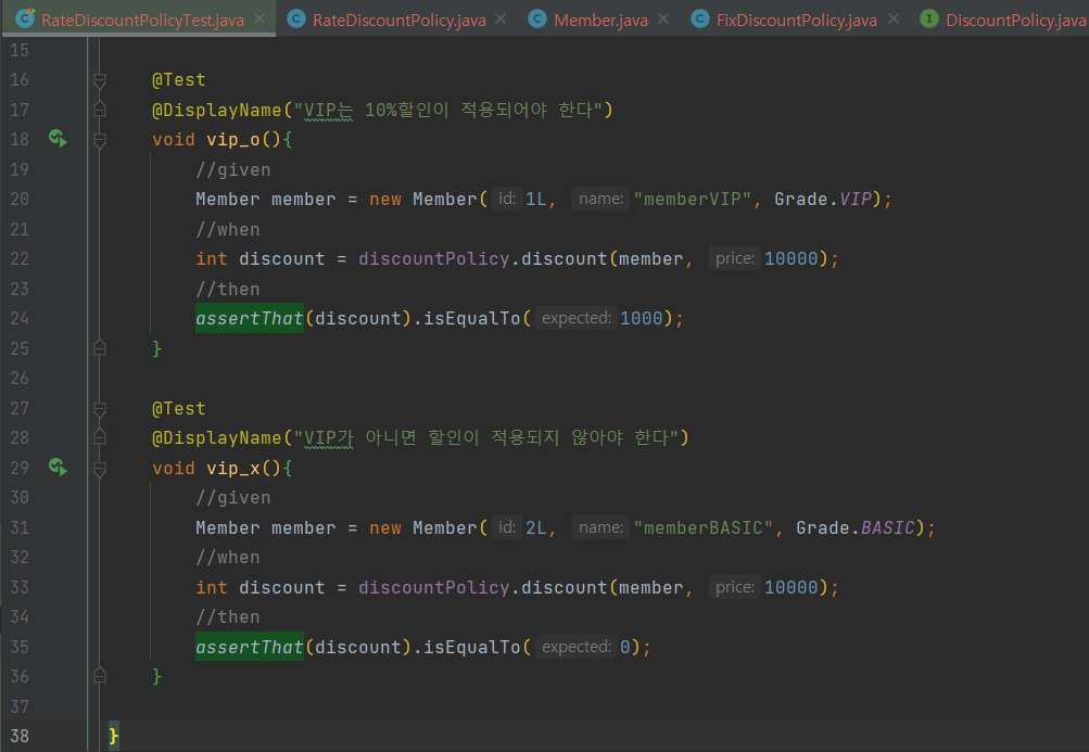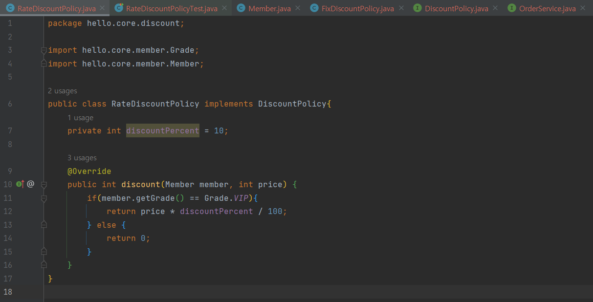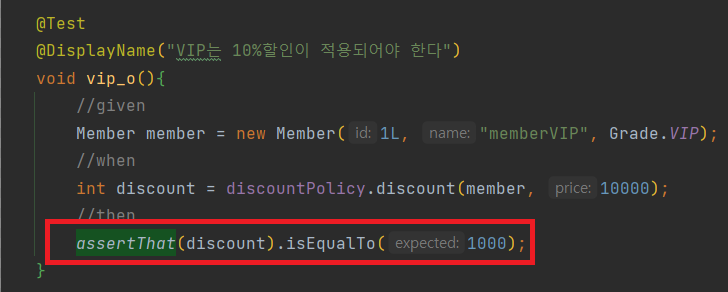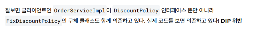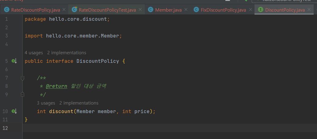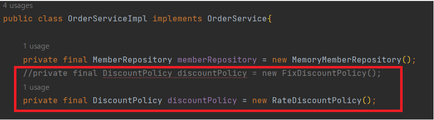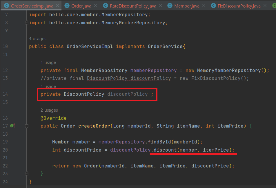 .discount(Member, itemPrice); 에서 DiscountPolicy에 값이 없기 때문에