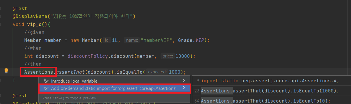 ALT + enter 후 import static 누르면 아래와 같이 코드가 간결해 짐