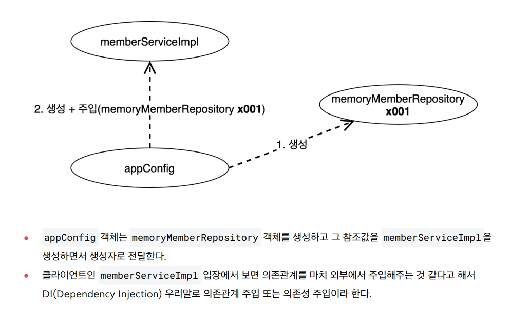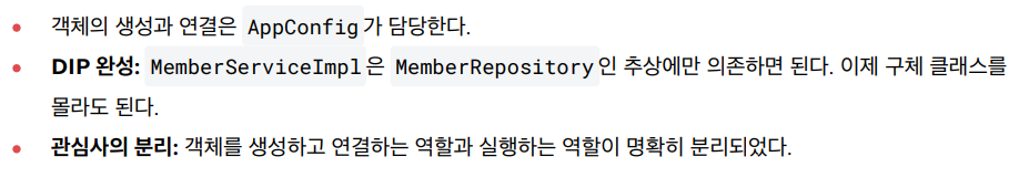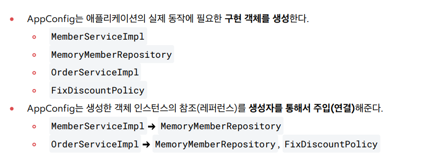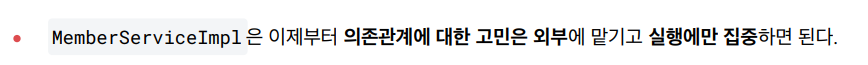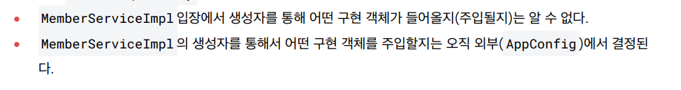 구현체인 MemberServiceImpl은 전혀 모름 (AppConfig에서 생성을 해서 넣어주면 됨. "생성자 주입"이라고도 함)