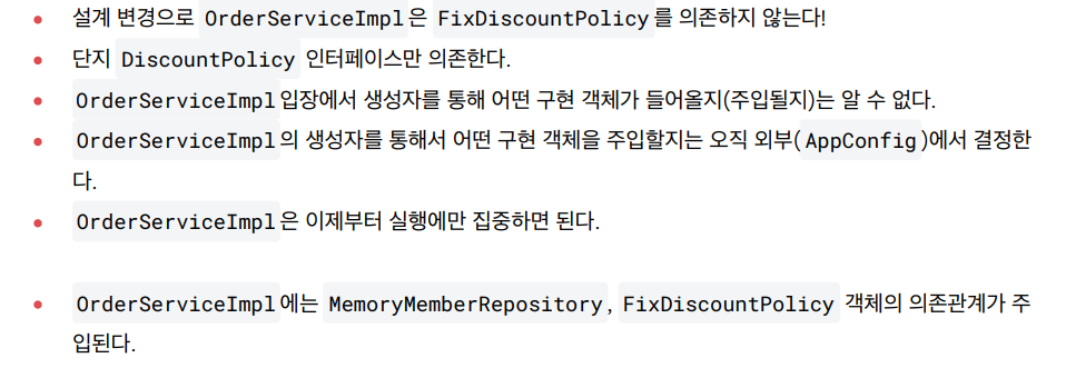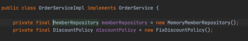 OrderServiceImpl : 철저하게 DIP를 지키고 있음. 인터페이스에만 의존, 구체적인 클래스 전혀 모름