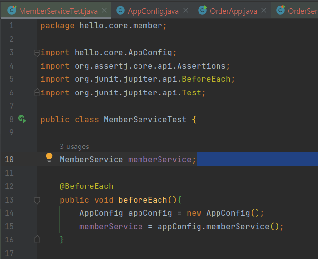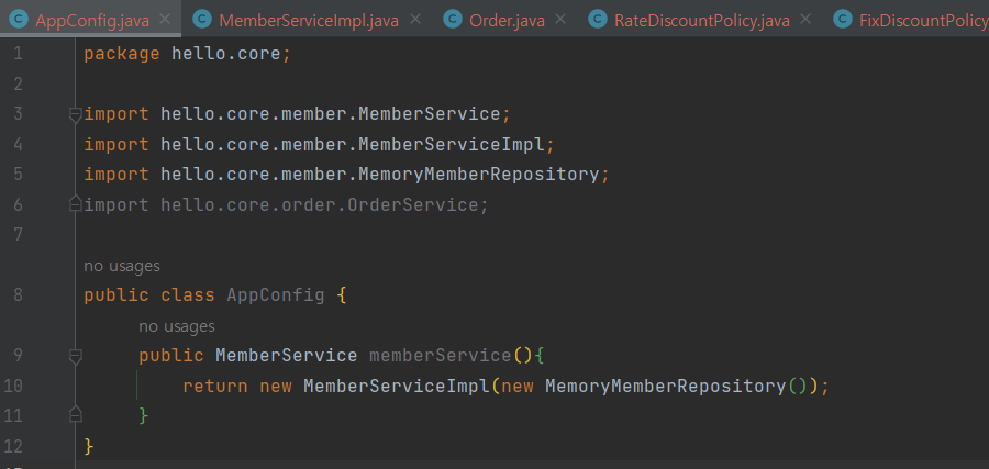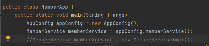 AppConfig를 통해 MemberService를 불러서 씀 -> MemberService구현체인 객체 MemberServiceImpl생성 됨