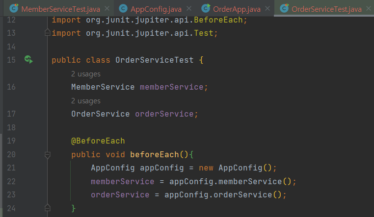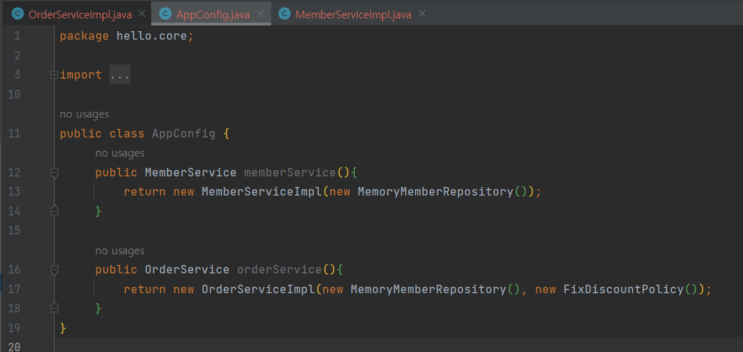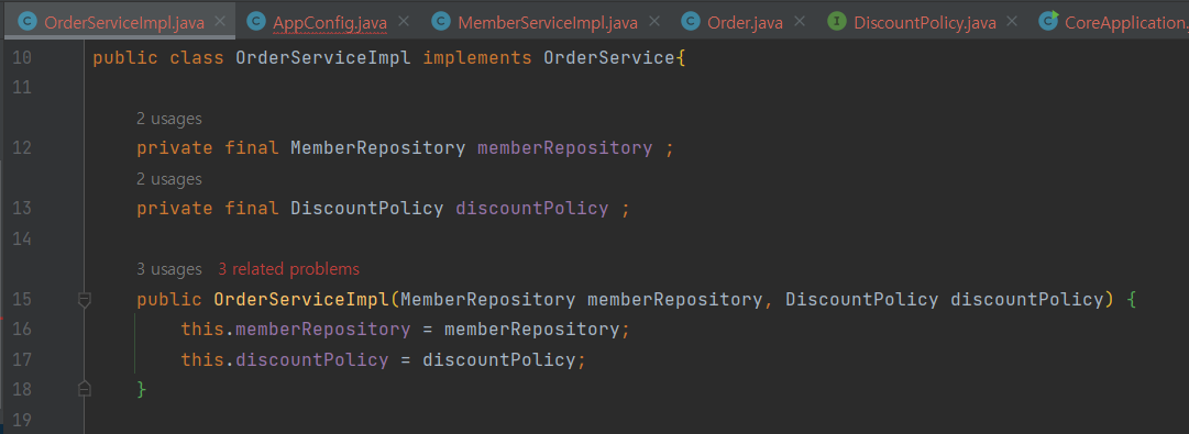 AppConfig를 통해 OrderService를 조회하면 OrderServiceImple이 반환이 되는데 MemoryRepository와 FixDiscountPolicy가 들어감