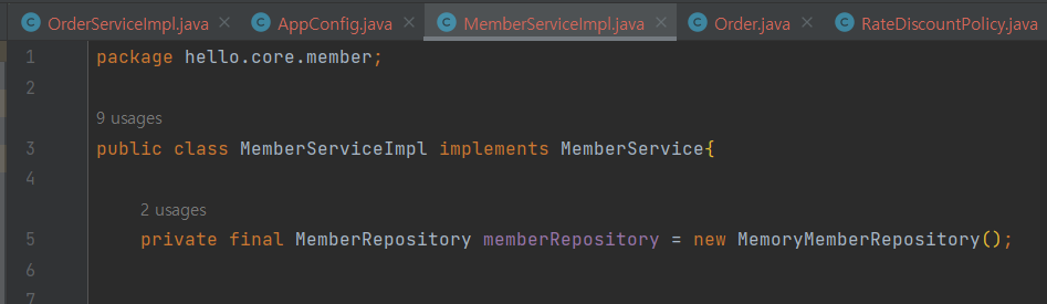 MemberServiceImpl에 MemoryMemberRepository 코드는 없다