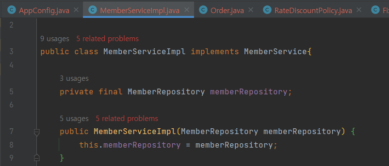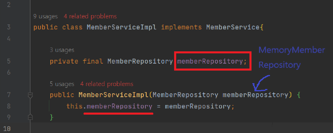 memberServiceImpl이 MemoryMemberRepository를 지정