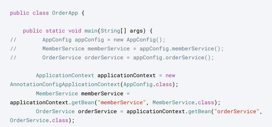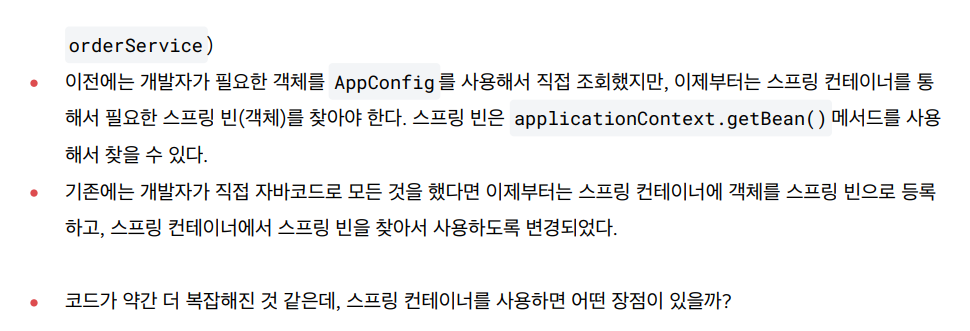기존에는 appConfig에서 직접 찾아왔으나 , Spring 컨테이너를 통해 찾아와야 한다