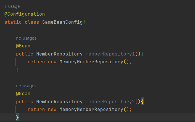 스프링 컨테이너가 뜰 때 SameBeanConfig로만 실행