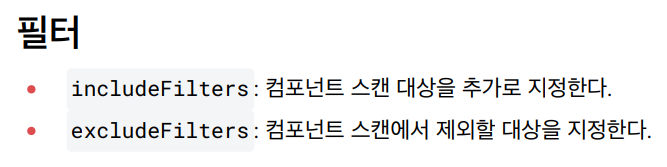 @Configuration 설정 정보 @ComponentScan: @component가 붙은 클래스를 찾아서 자동으로 빈으로 등록해 함 excludeFileters = @ComponentScan.Fileter 다 등록되는것에서 빼야할 빈들을 지정해 줌 @Configuration이 붙은것 빼겠다는 의미 자동 의존 관계 주입이 필요하다 @Autowired 기능을 생성자에 붙여주면 자동으로 연결해서 주입해 줌