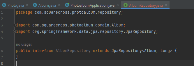 Spring Data JPA 에서는 간단한 CRUD 기능을 공통으로 처리하는 인터페이스를 제공 새로운 레코드 생성, 불러오기, Count 세기 등 간단한 CRUD기능들은 별도로 구현하지 않아도 제공되는 메소드를 호출하기만 한다면 사용 가능 위의 코드에서 JpaRepository를 상속 받았는데 , 제네릭 정보 안에 Domain 폴더 내에 만들었던 Album Entity와 Album ID(PK)타입인 Long을 입력하면 어떤 Entity를위한 Repository인지 정보가 있기 때문에 albumRepository에서 작업시 어떤 테이블에 데이터를 넣어야 할지 Spring이 알게 됨 사용자가 직접 정의하는 CRUD메서드 @Repository 어노테이션을 추가해서 스프링 빈으로 등록하여 IoC에서 관리하게 함..