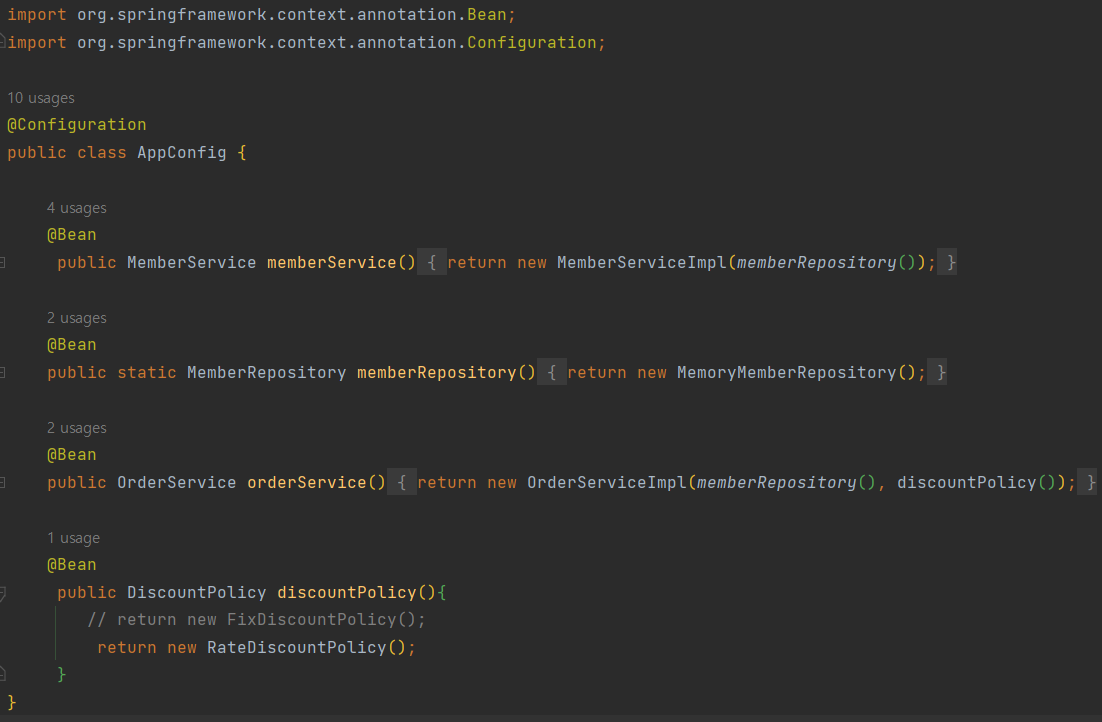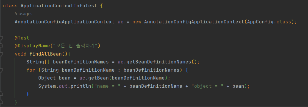 컨테이너에 등록된 모든 빈 조회 직접 등록한 빈만 조회 MemberService가 MemberServiceImpl의 instatnce이면 성공 구체 타입으로도 조회 가능, 그러나 유연성은 떨어짐. 테스트는 항상 실패테스트도 만들어야 함 Assertions에서 Alt + Enter누르면 줄일 수 있음 () -> ac.getBean("XXXXX", MemberService.class)로직을 실행하면 NoSuchBeanDefinitionException 예외가 터져야 성공 ! 안터지면 실패 스프링 컨테이너가 뜰 때 SameBeanConfig로만 실행 스프링 컨테이너가 스프링 빈 2개만 등록 테스트 진행하면 아래와 같은 오류 발생 NoUniqueBeanDefinitionException : found2 예외가 ..