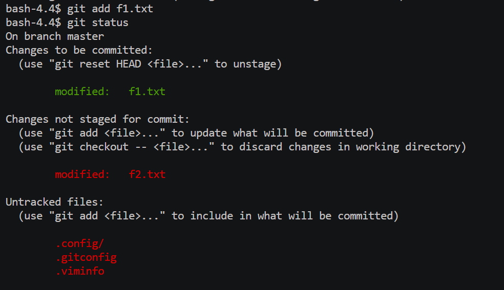 (f1.txt는 add했기때문에 commit대기 상태이며, f2.txt는 commit 대기 상태에 들어가 있지 않은 상태)